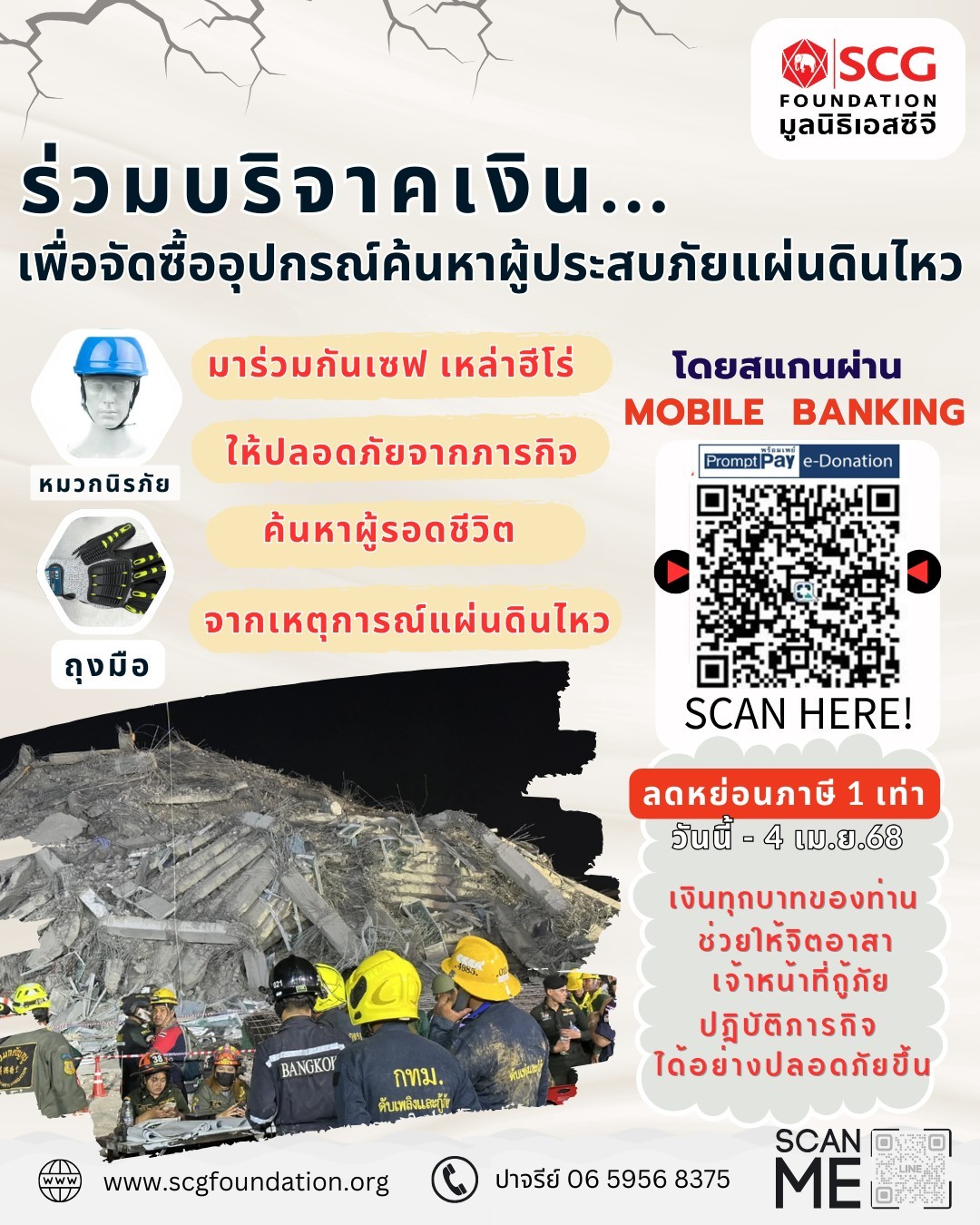 มูลนิธิเอสซีจี มอบความห่วงใยช่วยเหลือผู้ประสบภัยแผ่นดินไหว พร้อมส่งกำลังใจให้ฮีโร่แนวหน้า บุคลากรทางการแพทย์ และอาสากู้ชีพ กู้ภัย โดย มอบน้ำดื่ม เครื่องดื่มชูกำลัง ข้่าวสาร ผ้าเย็น ถุงมือ เสื้อกันฝน เตียงสนามกระดาษ หมวกนิรภัย สนับเข่า-ศอก และหน้ากากN95 ผ่านองค์กรและเครือข่ายต่างๆ เพื่อบรรเทาความเดือนร้อน และช่วยให้จิตอาสา เจ้าหน้าที่กู้ภัย ปฏิบัติภารกิจได้อย่างปลอดภัยขึ้น