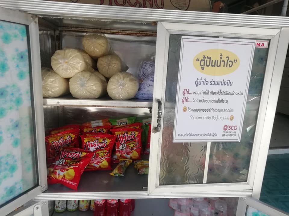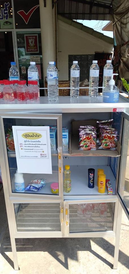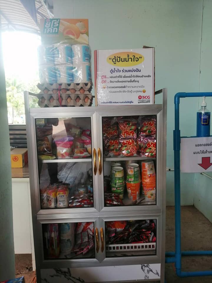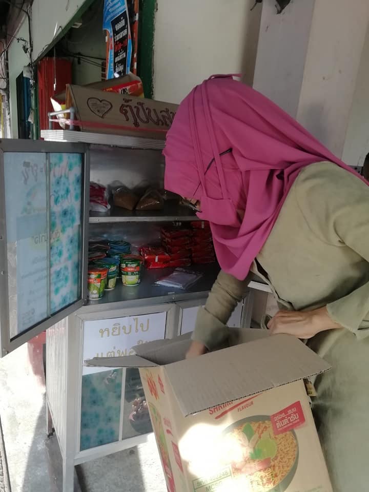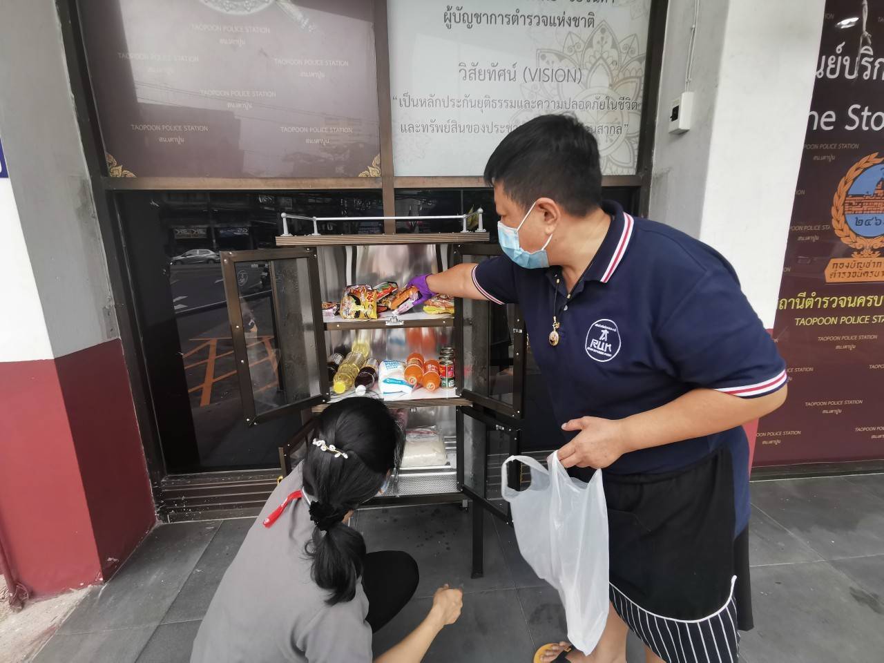 When the first “Pantry of Sharing” cabinet was introduced at Taopoon Police Station, neighborhood food sellers quickly came to add necessities, and people started taking items. In the evening on the same day, the number of items in the cabinet slightly decreased as despite people are taking things, but givers still come to add more.