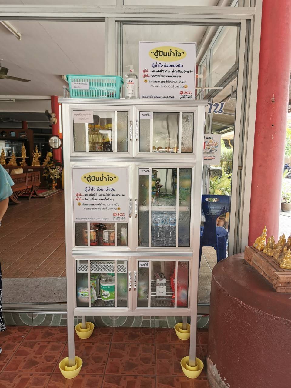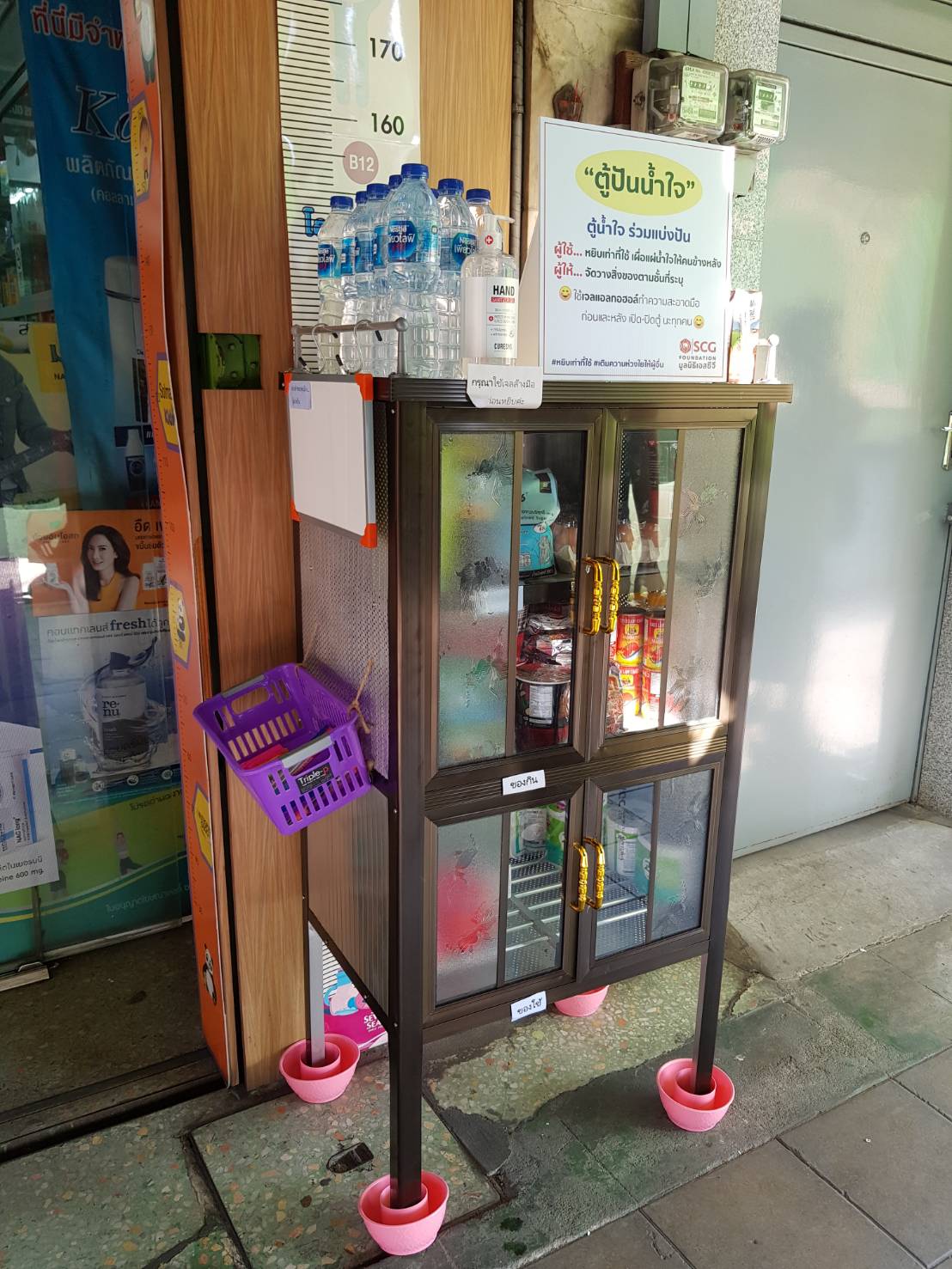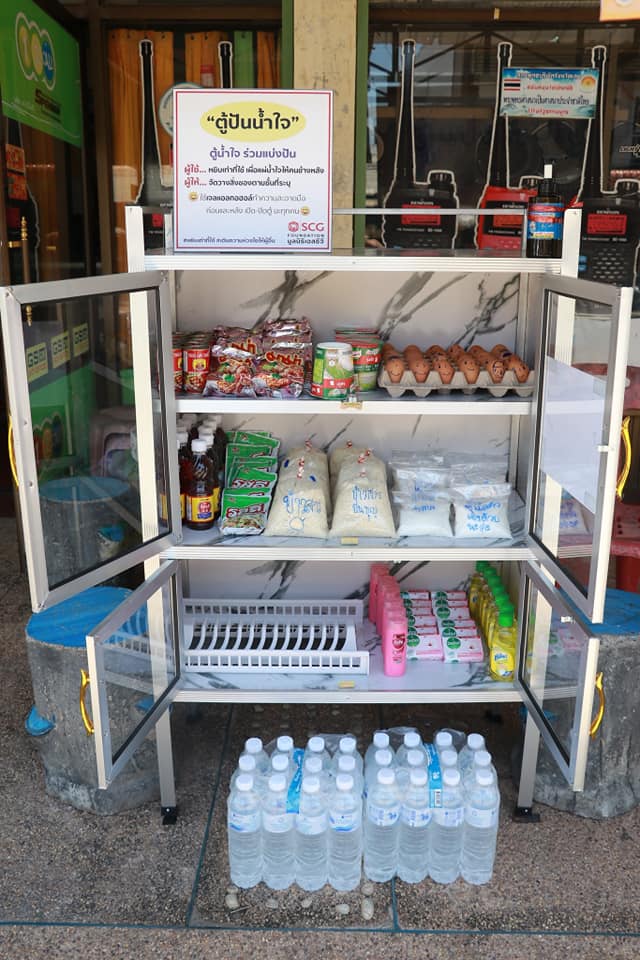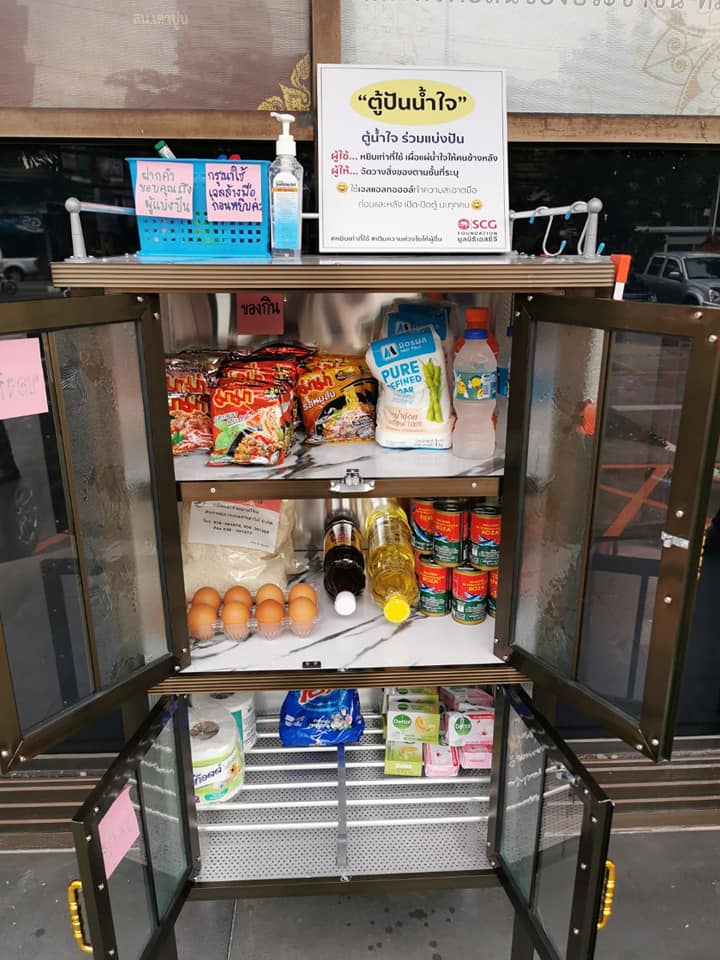 The “Pantry of Sharing” cabinets are filled with food and necessities such as rice, canned fish, instant noodles, drinking water, milk, tissue paper, sanitary napkin, soap, detergent, etc. The safety of givers and receivers is factored in when it comes to finding the right spots for pantry cabinets. As a result, community areas such as markets, police stations, train stations, temples, or schools are made locations for the pantry cabinet which can also be overseen by the police, taxi motorcycle riders, vendor sellers nearby.