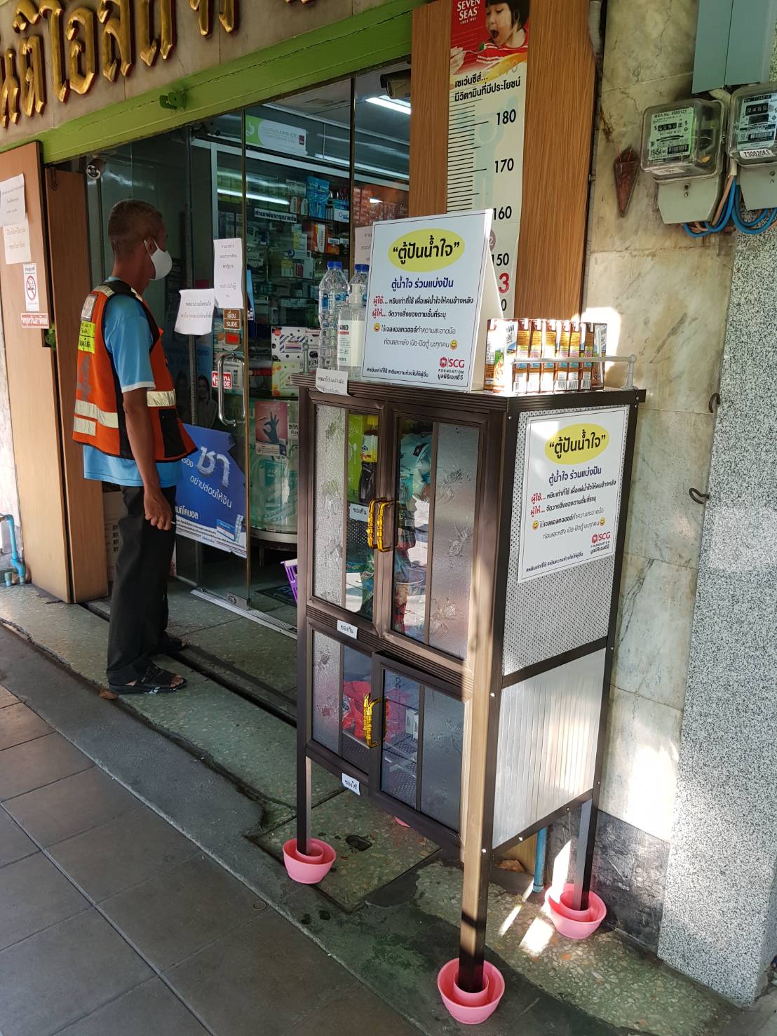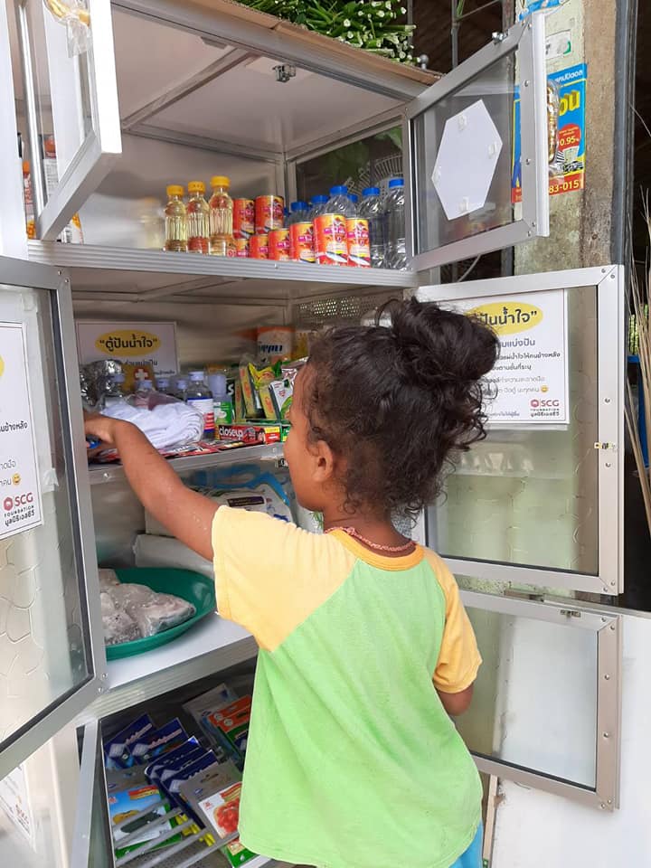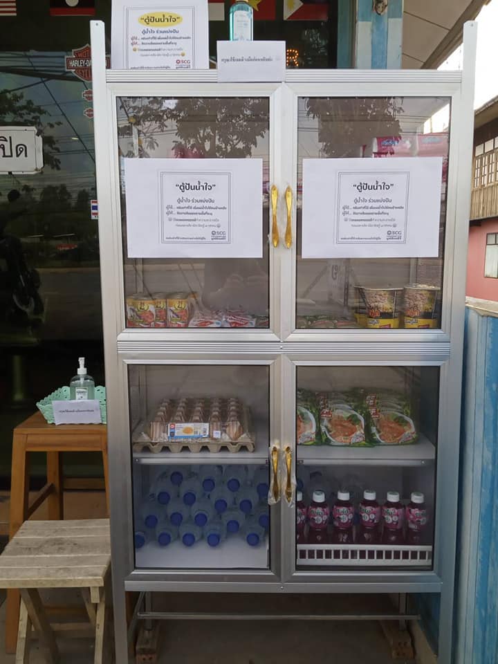The “Pantry of Sharing” cabinets are filled with food and necessities such as rice, canned fish, instant noodles, drinking water, milk, tissue paper, sanitary napkin, soap, detergent, etc. The safety of givers and receivers is factored in when it comes to finding the right spots for pantry cabinets. As a result, community areas such as markets, police stations, train stations, temples, or schools are made locations for the pantry cabinet which can also be overseen by the police, taxi motorcycle riders, vendor sellers nearby.