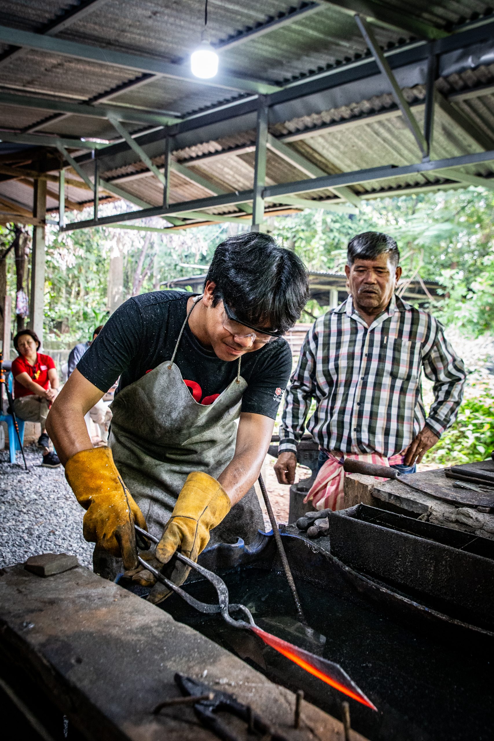 Thammarat “Earth” Moonsarn, a 22-year-old young community developer with the SCG Foundation, is a prime example of the “Learn to Earn” mindset. After completing his education at a high school level, he chose a different path from his peers, who mostly went to pursue education at a higher level. Earth realized throughout his studies that he was not the best learner, and decided to find his own way to learn and earn for the future of his life and career. When the opportunity came, he ventured into the art of ancient blacksmithing, a profession long associated with Mueang Phia, in the Ban Phai district of Khon Kaen, Thailand. And under the tutelage of renowned blacksmith Mr. Jamlong Soonthong—well known for practicing ancient techniques handed down to him from previous generations in the Phia sub-district of Khon Kaen—Earth was set on his way to a sustainable career path. He has since been motivated and driven to establish a place for himself in this field, and can now be considered part of the last generation of bladesmiths in the country. To date, he is the only inheritor of Mueang Phia’s secrets of high-quality blacksmithing.