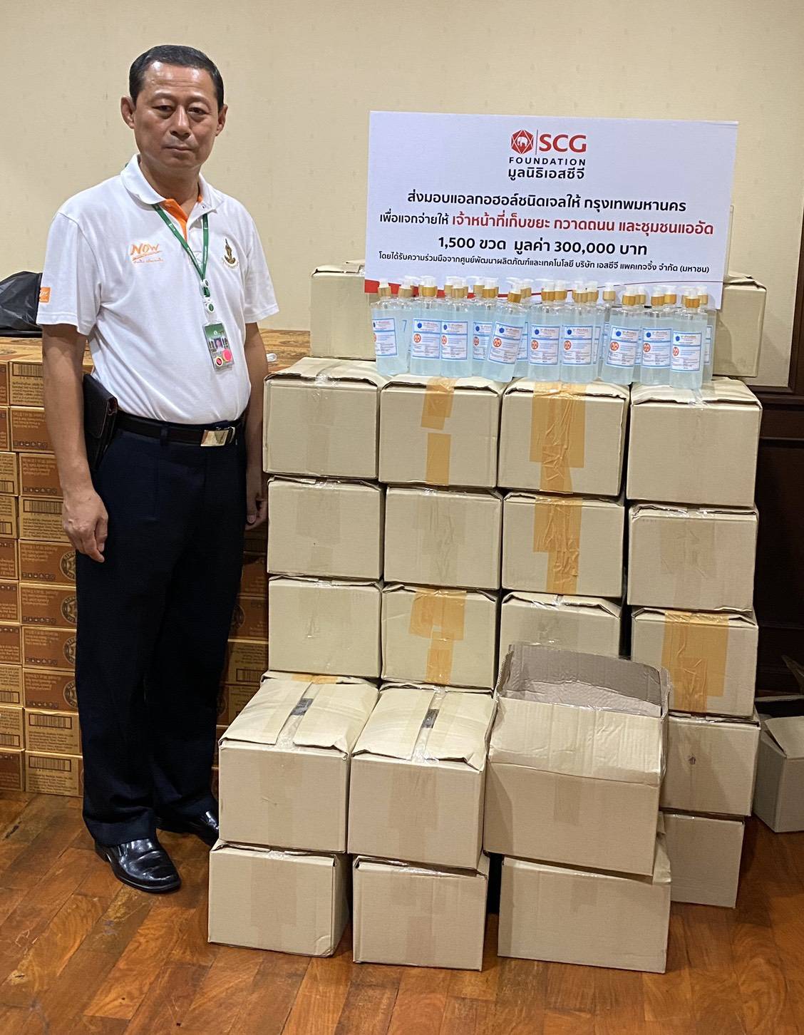 มูลนิธิเอสซีจี ร่วมกับศูนย์พัฒนาผลิตภัณฑ์และเทคโนโลยีเอสซีจี แพคเกจจิ้ง จัดทำแอลกอฮอลล์ชนิดเจล มอบให้กับกรุงเทพมหานคร เพื่อนำไปมอบต่อให้กับเจ้าหน้าที่เก็บขยะ กวาดถนน ได้นำไปใช้ขณะปฏิบัติหน้าที่ และชุมชนแออัดต่างๆ ต่อไป