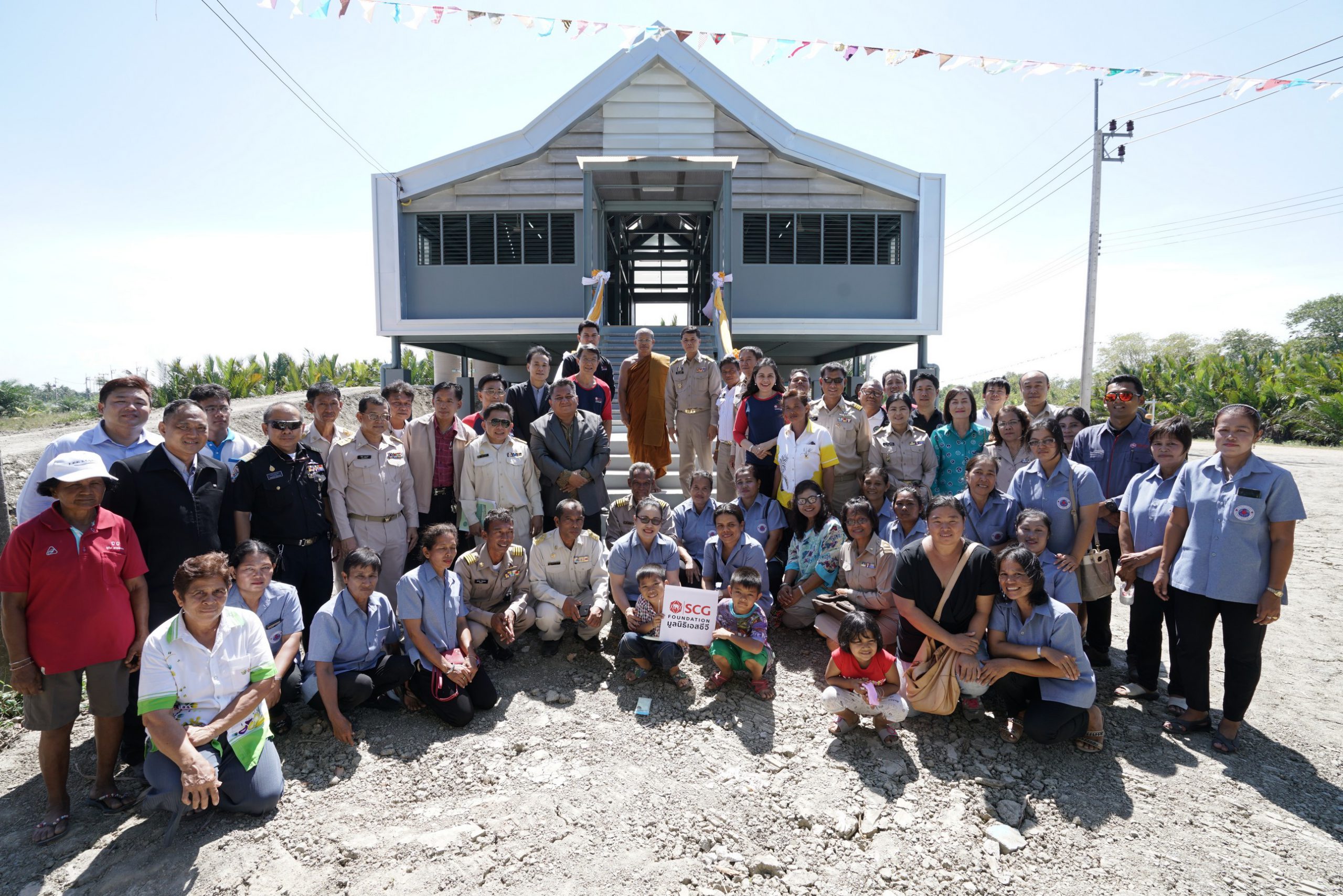 สุวิมล จิวาลักษณ์ กรรมการและผู้จัดการมูลนิธิเอสซีจี กล่าวว่า “มูลนิธิเอสซีจีร่วมกับสมาคมสถาปนิกสยาม ในพระบรมราชูปถัมภ์ ธุรกิจซีเมนต์และผลิตภัณฑ์ก่อสร้าง ในเอสซีจี และเพื่อนพนักงานเอสซีจีจิตอาสา จัดสร้างอาคาร “เอื้อสุข” ขึ้นในพื้นที่วัดโคกแสง ต.ขนาบนาก อ.ปากพนัง จ.นครศรีธรรมราช เพื่อให้เป็นสมบัติของคนในชุมชนได้ใช้พักพิงอาศัยในยามเกิดอุทกภัยและวาตภัย โดยอาคารเอื้อสุขเป็นอาคารอเนกประสงค์ มีคุณสมบัติแข็งแรง มั่นคง ทนทาน สามารถรองรับการเกิดอุทกภัยและวาตภัยได้ ตัวอาคารยกใต้ถุนสูง 2 เมตร เพื่อให้ชาวบ้านมั่นใจว่าน้ำจะไม่ท่วมถึงตัวอาคาร เนื่องจากที่ผ่านมา ที่ตั้งของอาคารแห่งนี้เคยถูกน้ำท่วมสูงสุด 60 เซนติเมตร ในขณะที่บริเวณอื่นๆ น้ำเคยท่วมสูงถึงเกือบ 2 เมตร ดังนั้น พื้นที่บริเวณวัดโคกแสงจึงถือเป็นจุดยุทธศาสตร์ที่เหมาะสมมากที่จะก่อสร้างอาคารเพื่อป้องกันอุทกภัย ชาวบ้านสามารถเข้ามาพักพิงหลับภัยบนอาคารได้ประมาณ 200 คน และพักพิงอยู่ได้เป็นระยะเวลานับแรมเดือน ด้านในอาคารจะมีห้องน้ำไว้ปลดทุกข์อย่างถูกสุขลักษณะ มีห้องสำรองเสบียงอาหารแห้ง มีพื้นที่สำหรับประกอบกิจวัตรประจำวัน เช่น หุงหาอาหาร ซักล้าง ฯ ซึ่งจะช่วยให้พี่น้องผู้ประสบภัยสามารถดำรงชีวิตอยู่ได้อย่างดีพอสมควรทีเดียว”