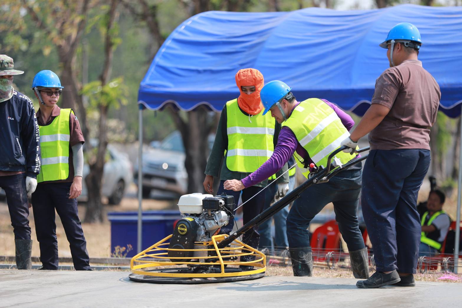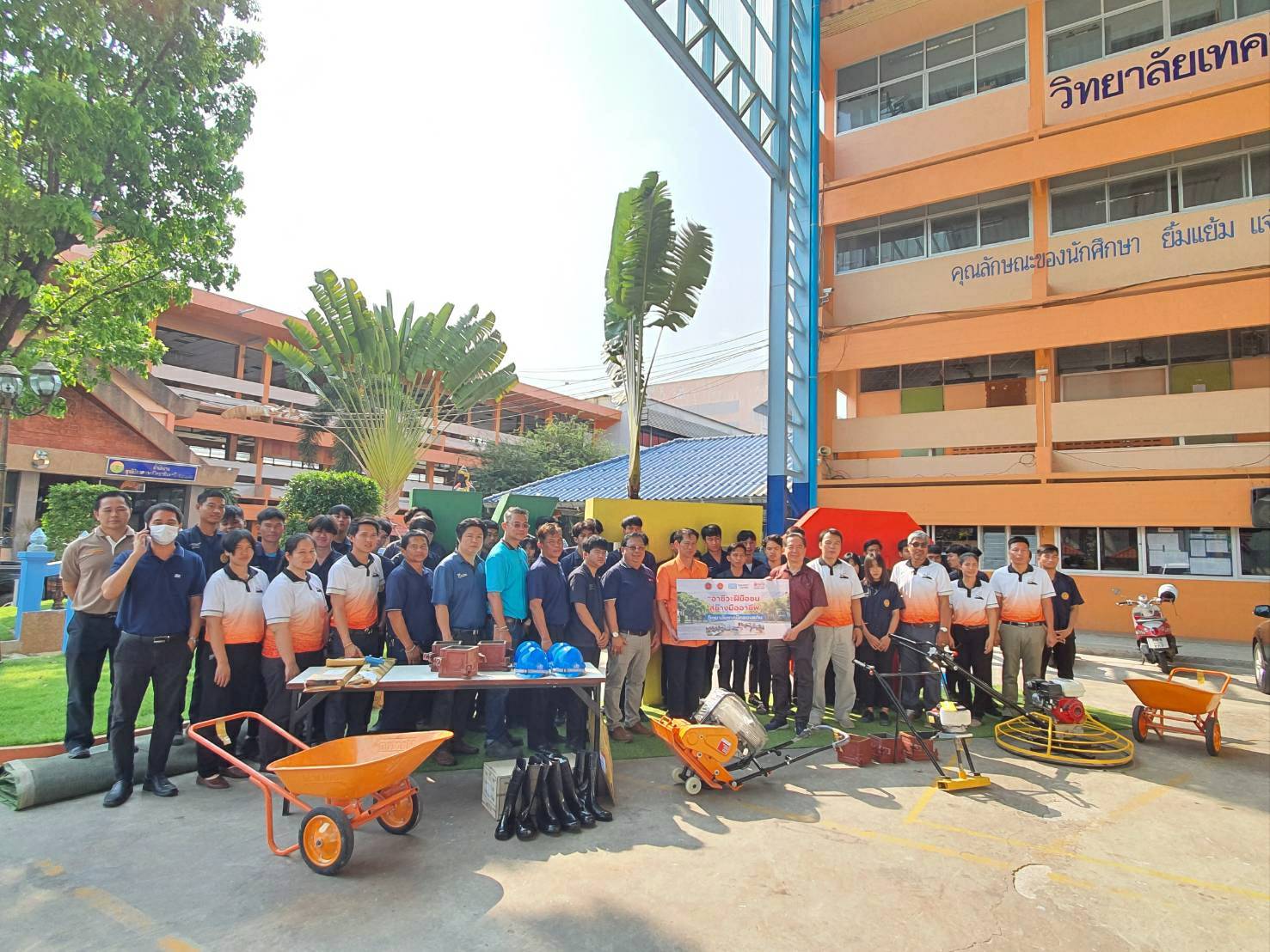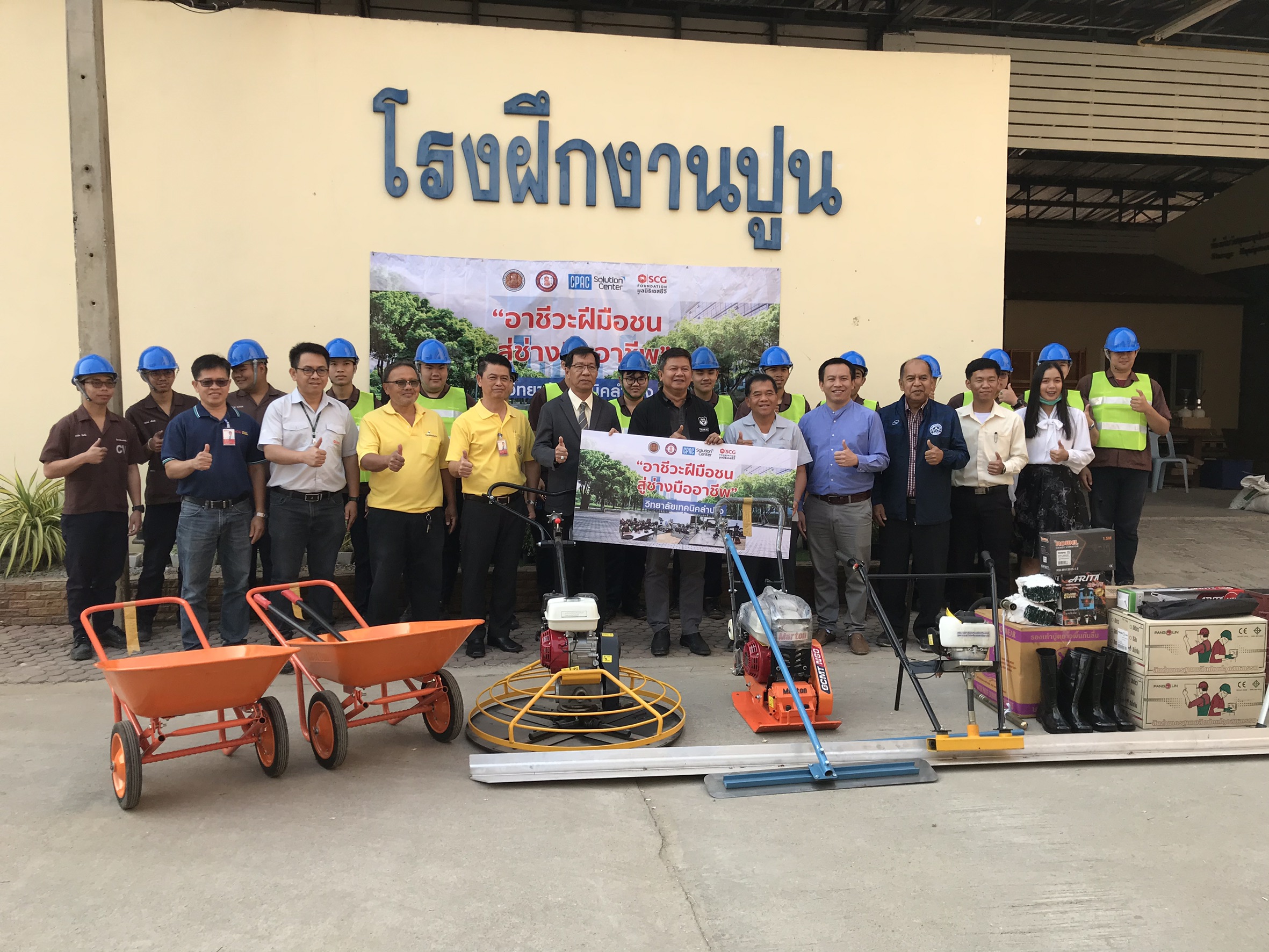 คุณสุวิมล จิวาลักษณ์ กรรมการและผู้จัดการมูลนิธิเอสซีจี กล่าวถึงความร่วมมือในครั้งนี้ว่า ด้วยตระหนักว่าผู้สำเร็จการศึกษาสายอาชีวะ เป็นบุคลากรที่มีความสำคัญในการพัฒนาประเทศ ทั้งภาคอุตสาหกรรม และการบริการ มูลนิธิเอสซีจี รวมถึงหน่วยงานภาครัฐ-เอกชน-ประชาสังคม จึงได้ร่วมมือกันทำงานเชิงรุกในโครงการสานพลังประชารัฐ ยกระดับคุณภาพวิชาชีพอาชีวศึกษา (Competitive Workforce) เพื่อที่จะผลักดันให้เกิดการพัฒนาและการสร้างอาชีวศึกษาให้มีความเป็นเลิศ เพิ่มคุณภาพผู้ เรียน นับแต่นั้นเราไม่เคยหยุดสนับสนุนการดำเนินงานของอาชีวะ เพื่อสร้างบุคลากรที่มีคุณภาพของประเทศ และแม้ว่าภาวะเศรษฐกิจของประเทศจะชะลอตัว ส่งผลให้ความต้องการแรงงานในอุตสาหกรรมต่างๆ น้อยลง ไม่เว้นแม้แต่ในอุตสาหกรรมการก่อสร้างขนาดใหญ่ แต่กลับมีความต้องการบุคลากรที่มีทักษะฝีมือ มีความเชี่ยวชาญ มีความเป็นมืออาชีพ ในงานซ่อมแซมต่อเติม งานรับเหมาขนาดกลางและขนาดเล็กเพิ่มมากขึ้น และด้วยเจตนารมณ์ของการดำเนินโครงการที่สร้างประโยชน์ให้แก่การศึกษา รวมถึงสร้างบุคลากรมืออาชีพที่ตอบโจทย์ความต้องการของประเทศ มูลนิธิเอสซีจี จึงได้เข้ามาสนับสนุนอุปกรณ์เครื่องมือที่ทันสมัยในงานก่อสร้าง อาทิ เครื่องขัดมันแบบเครื่องยนต์ เครื่องตบดิน กรรไกรตัดเหล็ก เครื่องตั้งระบบเลเซอร์ เกรียงยาว แบบหล่อ CUBE รถเข็นปูน แบบหล่อเหล็กตัวซี เครื่องจี้คอนกรีต เครื่องแต่งผิวหน้าคอนกรีต ตะกร้อตบดิน อุปกรณ์เซฟตี้และอื่นๆ เพื่อใช้ในการเรียนการสอน แก่วิทยาลัยนำร่องที่เข้าร่วมโครงการทั้ง 11 แห่ง รวมมูลค่ากว่า 1,500,000 บาท
